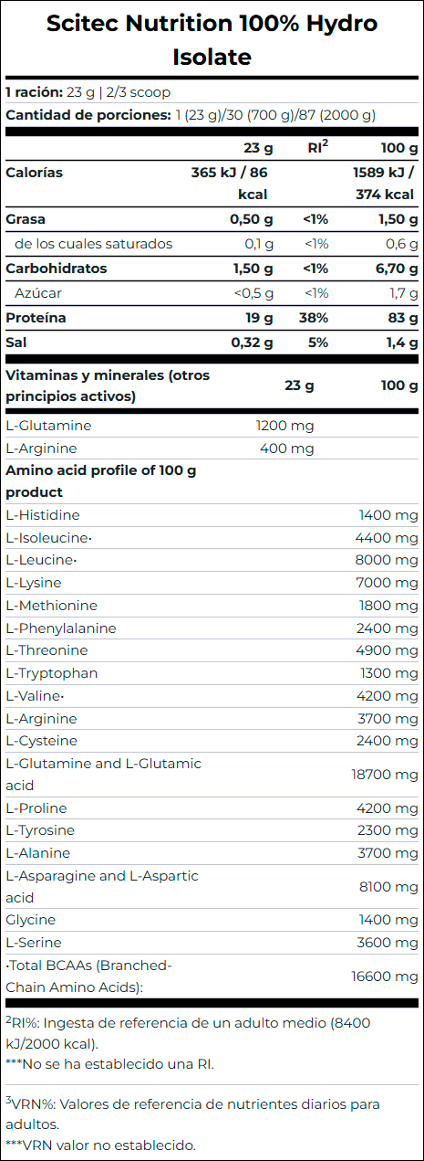 VAINILLA: Proteína de suero hidrolizada instantánea 85% [Aislado de proteína de suero hidrolizada, Emulsionante: Lecitinas (Soja)], Aromas, L-Glutamina 5.2%, L-Arginina 1.7%, Sal, Edulcorantes (Sucralosa, Acesulfamo K).