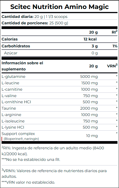 Ingredientes (manzana): L-glutamina, maltodextrina, corrector de acidez (ácido cítrico anhidro), taurina, aroma (manzana), L-leucina, L-arginina, L-carnitina L-tartrato, L-isoleucina, L-valina, clorhidrato de L-lisina, clorhidrato de L-ornitina, edulcorantes (acesulfamo K, sucralosa), colorantes (caramelo amónico, riboflavina), BioPerine® (extracto de Piper nigrum 50:1), naringina extraída de Citrus paradisi (extracto 25:1).