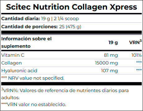Además de 15 gramos de colágeno, una ración de Collagen Xpress contiene también vitamina C, que al apoyar la formación normal de colágeno, contribuye al funcionamiento normal de la piel, las venas, los huesos y los cartílagos.*Por consiguiente, es un componente importante de todo producto apropiado para apoyar las reservas de colágeno del organismo. Además, el producto se ha enriquecido con ácido hialurónico.
