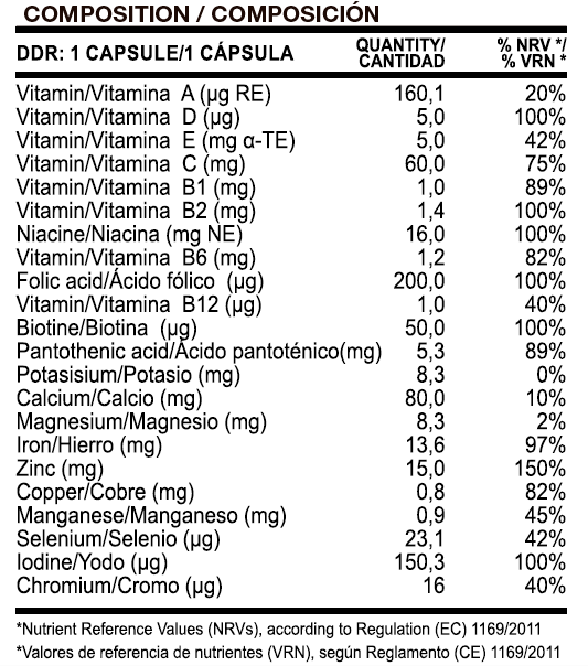 Carbonato cálcico, cápsula [gelatina bovina], fosfato de magnesio, ácido L-ascórbico (vitamina C), agente de carga: celulosa microcristalina, fumarato ferroso, óxido de zinc, cloruro potásico, nicotinamida (niacina), DL-α-tocoferol acetato (vitamina E), gluconato de manganeso, gluconato de cobre, D-pantotenato cálcico (ácido D-pantoténico), clorhidrato de piridoxina (vitamina B6), riboflavina (vitamina B2), clorhidrato de tiamina (vitamina B1), acetato de retinilo (vitamina A), colorante: carotenos, antiaglomerantes: sales magnésicas de ácidos grasos y dióxido de silicio, ácido pteroilmonoglutámico (ácido fólico), yoduro potásico, picolinato de cromo, selenito sódico, D-biotina (biotina), colecalciferol (vitamina D), cianocobalamina (vitamina B12).
