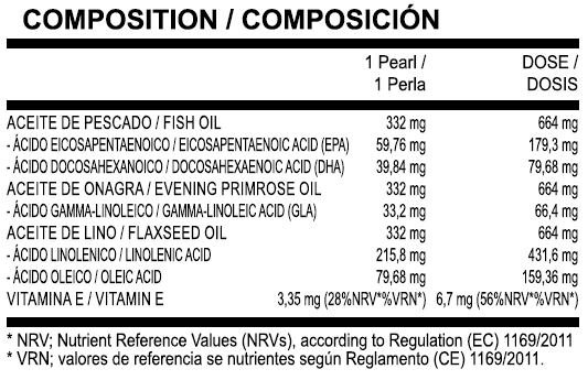 Aceite de PESCADO, aceite de semilla de lino, aceite de onagra, D-alfa-tocoferol (Vitamina E) y antioxidantes vitaheess Plus (tocoferoles naturales, palmitato de ascorbilo y galato de propilo). Perla (gelatina y humectante: E-422).