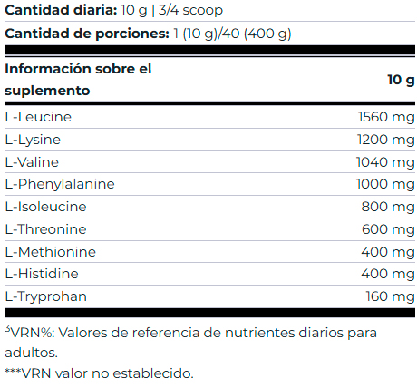 Limonada rosa: L-leucina 16%, L-lisina HCl 15%, ácidos (ácido málico, ácido cítrico), L-valina 10%, aromas, L-fenilalanina 10%, L-isoleucina 8%, L-treonina 6%, L-histidina 4%, L-metionina 4%, L-triptófano 2%, edulcorantes (sucralosa, acesulfamo K), concentrado de remolacha en polvo [maltodextrina, concentrado de remolacha, acidulante (ácido cítrico)].