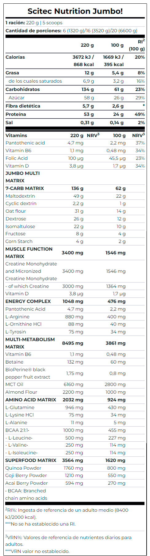 Jumbo, fiel a su nombre, ayuda a aquellos que buscan ganar volumen para lograr ese excedente de calorías más fácilmente. Contiene 135 g de carbohidratos y 53 g de proteína por dosis, esto hace que podamos aumentar la cantidad de macronutrientes consumidos en un día y por lo tanto la cantidad de calorías que ingerimos diariamente.