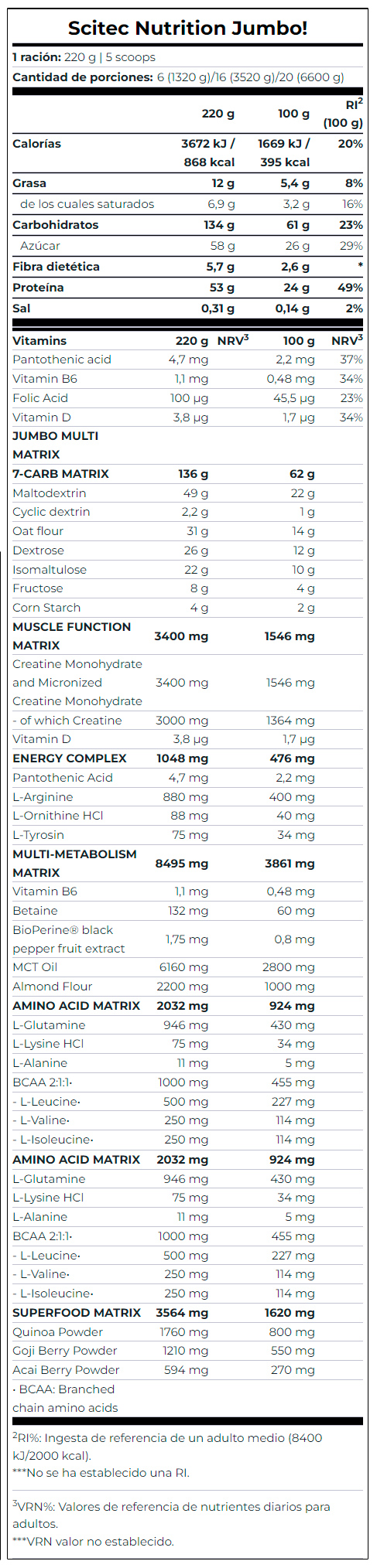 Jumbo, fiel a su nombre, ayuda a aquellos que buscan ganar volumen para lograr ese excedente de calorías más fácilmente. Contiene 135 g de carbohidratos y 53 g de proteína por dosis, esto hace que podamos aumentar la cantidad de macronutrientes consumidos en un día y por lo tanto la cantidad de calorías que ingerimos diariamente.