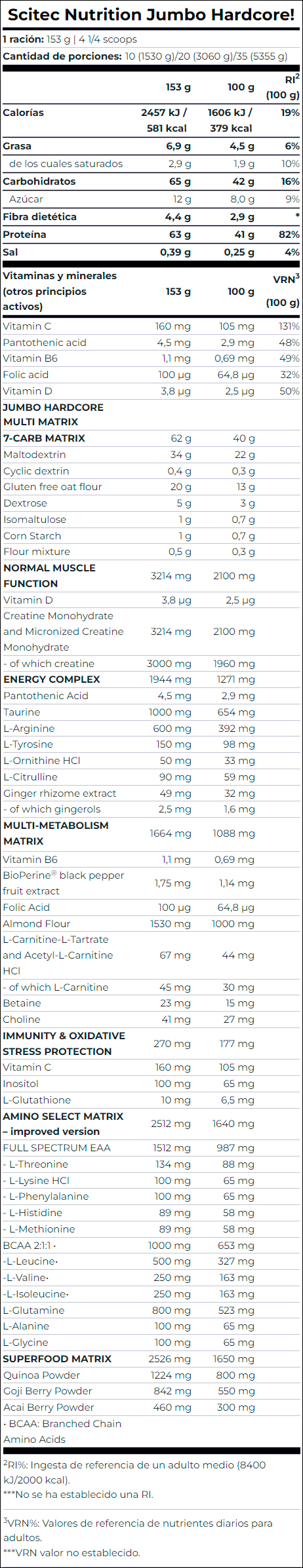 Sabor chocolate: concentrado de proteína de suero ( leche ) 33%, maltodextrina 22%, harina de copos de avena 13%, cacao en polvo desgrasado, concentrado de proteína de leche 4,8%, aromas, dextrosa 3,3%, proteína de vacuno hidrolizada 2,0%, monohidrato de creatina 1,1%, creatina anhidra 1,0%, harina de almendras , harina de quinoa, almidón de maíz 0,7%, isomaltulosa 1 0,7%, taurina, polvo de bayas de goji, L-glutamina, caseinato de calcio instantáneo ( leche ) [caseinato de calcio ( leche ), emulgente (mono y diglicéridos de ácidos grasos)], emulgente (lecitinas), L-arginina 0,4%, aislado de proteína de suero instantáneo ( leche ) 0,3% {aislado de proteína de suero ( leche ), emulgente [lecitinas (soja)]}, L-leucina, mezcla de harinas ( salvado de avena , quinoa, amaranto, trigo sarraceno, mijo) 0,3%, polvo de bayas de acai, dextrina cíclica (maltodextrina) 0,3%, proteína de arroz, espesante (goma xantana), L-valina, L-isoleucina, antiaglomerante (dióxido de silicio), edulcorantes (sucralosa, acesulfamo K), vitamina C (ácido L-ascórbico), L-tirosina, L-treonina, bitartrato de colina 0,07%, clorhidrato de L-lisina, glicina, L-alanina, L-fenilalanina, inositol, L-citrulina, L-histidina, L-metionina, clorhidrato de L-ornitina, L-tartrato de L-carnitina, preparación de extracto de jengibre [extracto de rizoma de jengibre ( Zingiber officinale ), [maltodextrina], betaína 0,02%, acetil-L-carnitina, L-Glutatión, ácido pantoténico (D-pantotenato de calcio), BioPerine ® pimienta negra ( Piper nigrum ) extracto de fruto 0,001%, vitamina D (colecalciferol), vitamina B6 (clorhidrato de piridoxina), ácido fólico (L-metilfolato de calcio).